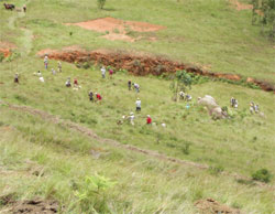Rund 5100 Laub- und Nadelbäume wurden dieser Tage auf dem ehemals kahlen Hügel Anosivola nahe der Hauptstadt bei der sechsten Pflanzaktion der Erde zu gutem Wachstum anvertraut. Professor Dr. Andri Mahefa, Präsident der in Leipzig ansässigen Gesellschaft, informierte die Dorfbevölkerung über die nachahmenswerte Geste der Kinder in der bayrischen Landeshauptstadt und bat den einheimischen Wächter des weithin sichtbaren "Schwarzwaldes", das Gedeihen der von der Tagesstätte finanzierten Bäumchen ganz besonders im Auge zu behalten. Anne Raab wird natürlich nach der Rückkehr in Wort und Bild genauestens über die Verwendung der Spende berichten.