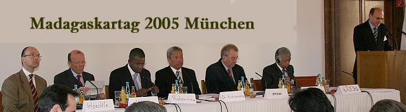 Hochrangige Politiker und Vertreter der Wirtschaft beim Madagaskar-Wirtschaftstag v.l.n.r: Herr Hoeckle (IHK), Helgo Alberts (IHK), Jean Jacques Rabenirina (madag. Minister für Tourismus und Kultur), Denis Andriamandroso (Botschafter Madagaskars), Hans Spitzner (Staatssekretär im Bayer. Wirtschaftsministerium), Norbert Lala Ratsirahonana (Sonderbotschafter des Madegassischen Staatspräsidenten Marc Ravalomanana - Staatspräsident und Premierminister Madagaskars 1996/97), Michael Krebs (vom Vorstand des Vereines "Madagasikara e.V.", dem Organisator des Madagaskartages) Foto: © 2005 by Vinzenz Spaniol Norbert Lala Ratsirahonana, Sonderbotschafter des madag. Präsidenten Ravalomanana: POLITISCHE UND WIRTSCHAFTLICHE RAHMENBEDINGUNGEN FÜR EINE NACHHALTIGE UND RASCHE ENTWICKLUNG. >>>>> Wirtschaftsbeziehungen Bayern - Madagaskar >>>>> Madagaskar - Die Dritte Republik: ALLGEMEINE POLITIKLEITLINIE FÜR DAS JAHR 2005 >>>>> Madakaskar - Volkswirtschaftliche Kennzahlen >>>>> GUIDE - Geschäftsgründungen in Madagaskar >>>>>> ELEKTRIZITÄT UND MINERALÖLSEKTOR IN MADAGASKAR >>>>> Der ländliche Bereich Madagaskars >>>>> Millenium Challenge Account Madagascar >>>francais>>> Referat über die Touristische Entwicklung Madagaskars >>>>>> Tourismus Masterplan Executive Summary (english) >>>doc>>> Merkblatt: "Investieren in Madagaskar" >>>pdf-deutsch >>>> Deutsche